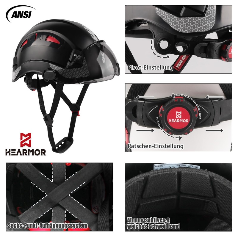- 【Safety and Comfort】HEARMOR safety helmet hard hat features a 6-point suspension system that provides the user with a secure and comfortable fit. This system evenly distributes the weight of the hardhat, reducing strain on the head and neck. Y-shaped chin strap is used in conjunction with a moulded chin strap cup for extra safety and stability. It accommodates different head sizes and shapes, with adjustable sizes ranging from 53-63 cm/20.86-24.80 inches.