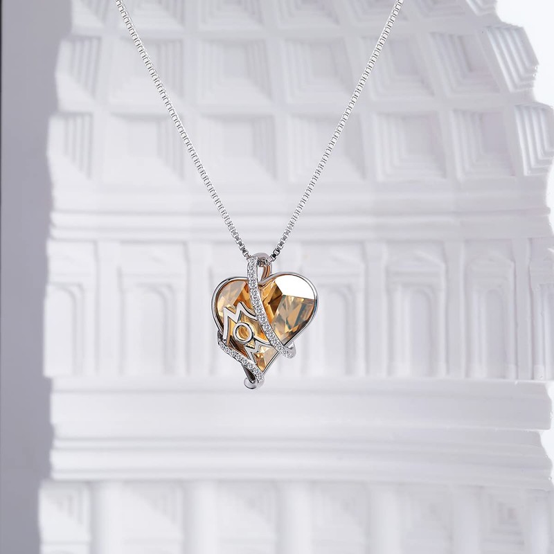 Heart Crystal Mom Necklace Love Heart Mother Necklace Sterling Silver Necklace for Women Champagne Crystal Necklace I Love You Mom Necklace Pendant Mothers Day Necklace
