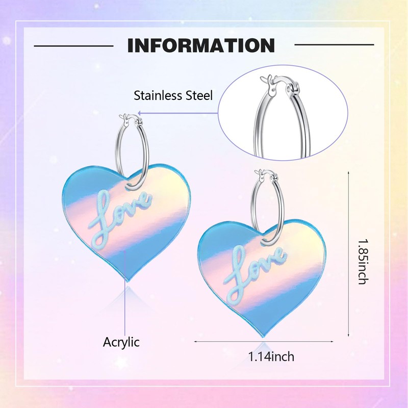 • ❤ Acrylic Laser Earrings ❤: Acrylic heart shape earrings are 1.14*1.85inch, 1.14*1.55inch, both of lightweight. It's a cute dangle earrings for women, easy and comfortable to wear.