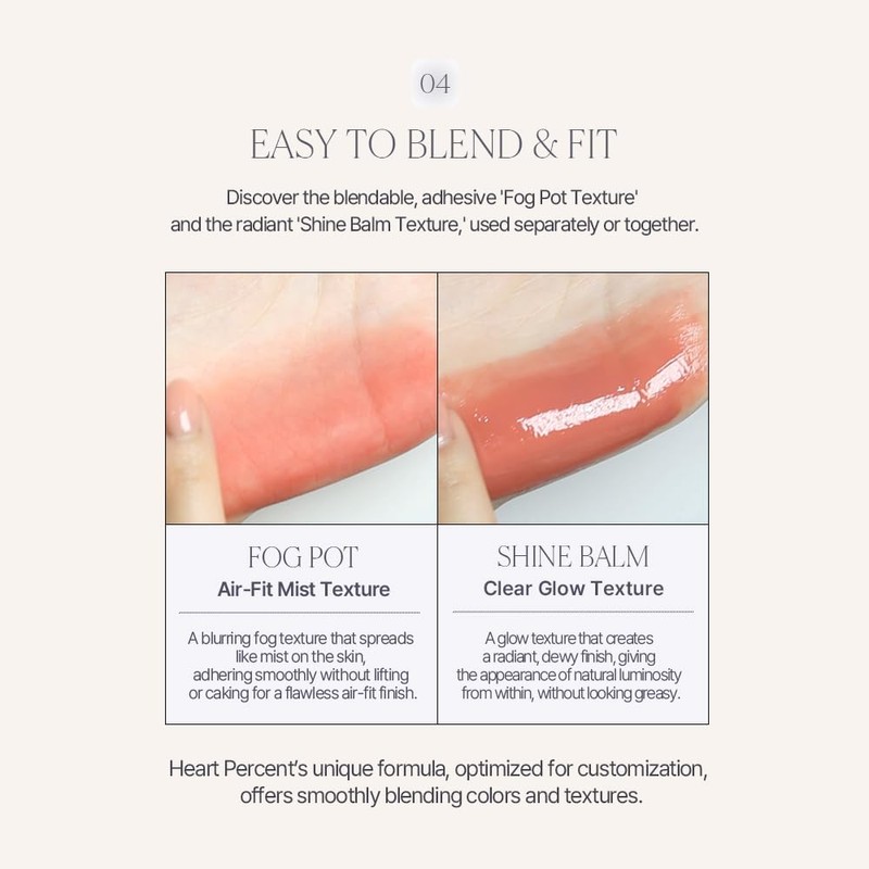- [EASY TO BLEND & FIT] FOG POT: Air-Fit Mist Texture. A blurring fog texture that spreads like mist on the skin, adhering smoothly without lifting or caking for a flawless air-fit finish. SHINE BALM: Clear Glow Texture. A glow texture that creates a radiant, dewy finish, giving the appearance of natural luminosity from within, without looking greasy. Heart Percent’s unique formula, optimized for customization, offers smoothly blending colors and textures.