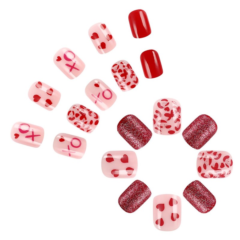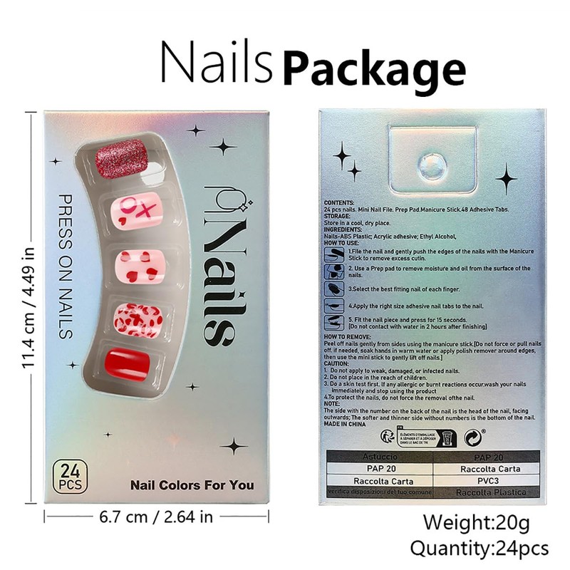 - Package Contains: Our square press on nails designs heart false nails is exquisite and beautiful. It contains 24 pcs Valentines day fake nails and a set of DIY nail art tools. There are 12 different sizes of fake nails. You can choose the most suitable love fake nails for yourself.