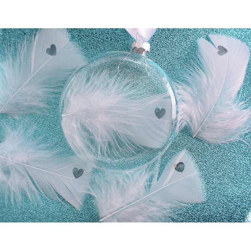 PLEASE NOTE: These are real feathers, wording is ON THE FEATHER not the bauble. The bauble is a perfect circle therefore the worded feather can move around inside the bauble (see 4th photograph). Should your feather move this can be rectified by either shaking the bauble so that it spins to your desired place or removing the removable cap and maneuvering the feather back to your desired position with tweezers. Due to feather absorbency, the writing can be anything from mid grey to blackest black. Hand stamping is where each letter is stamped by hand, whilst I am extremely good at stamping, this gives a very charming effect of not being exactly 'uniform' in its spacing/lines which adds to the character of your product. Each feather is unique, there are examples showing the difference in stamping and feather size/style in the photographs in this listing.