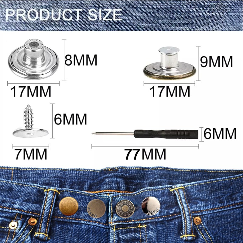 - Material: The jean buttons for loose jeans are crafted from a mix of brass and zinc alloy, providing super strength and durability. They are sturdy, durable, and rust-resistant, ensuring long-lasting wear.
