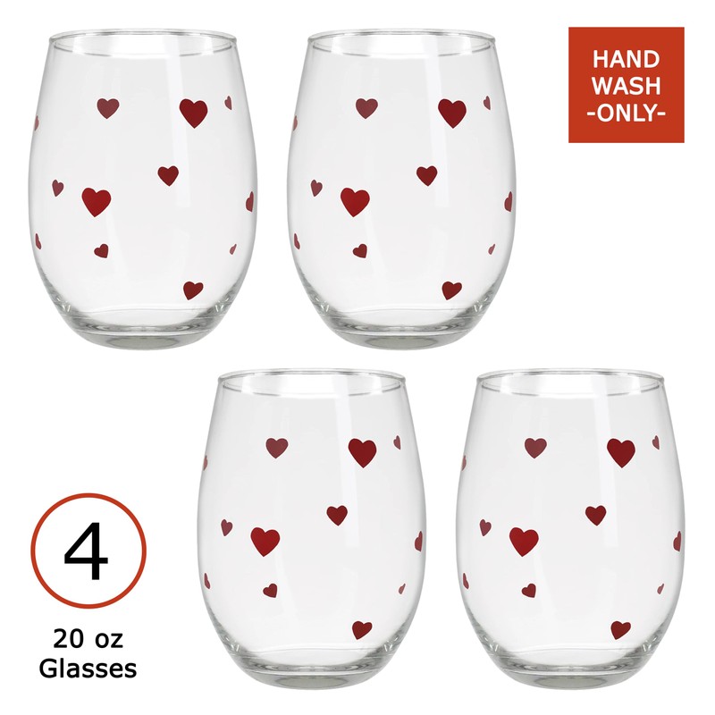 - HEARTS WINE GLASS SET: Set of 4 Stemless Clear Wine Glass with red hearts. 20 oz