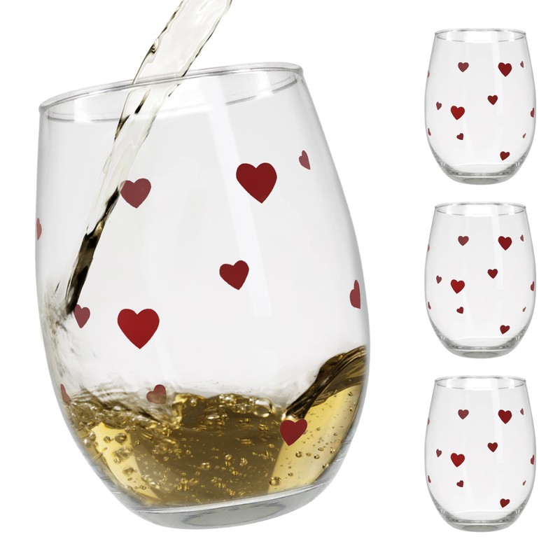 - HEARTS WINE GLASS SET: Set of 4 Stemless Clear Wine Glass with red hearts. 20 oz