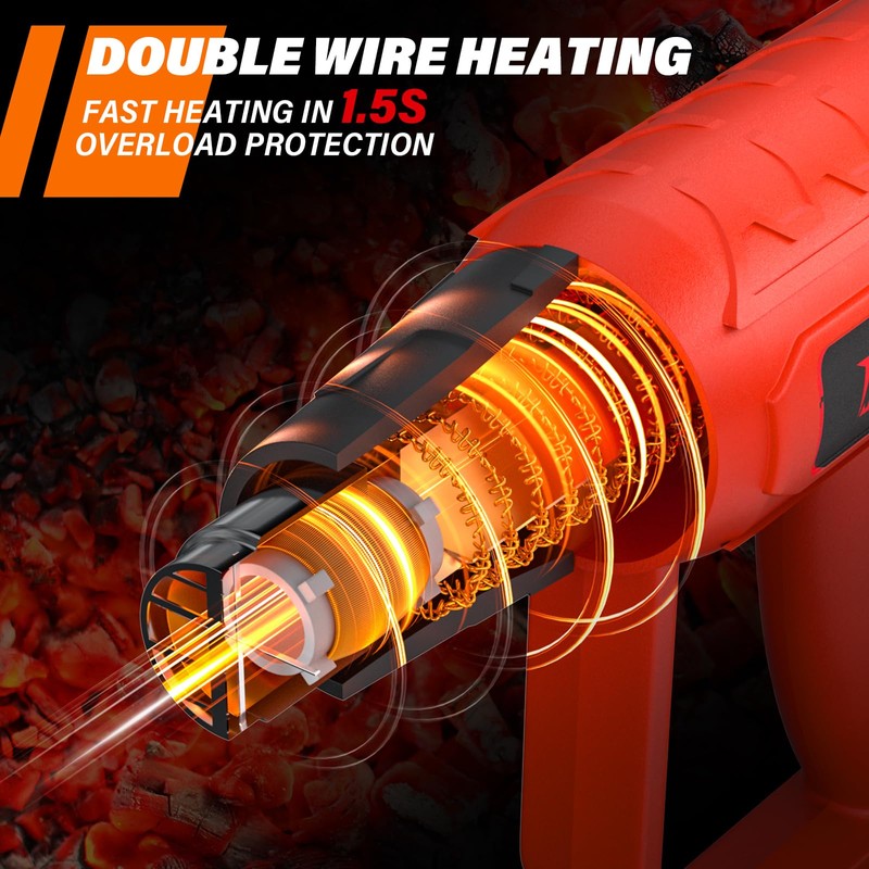 - 🎊【Variable Temp Control】Heavy duty heat gun with 2 variable temperature adjustment allows you to work on your project using consistent and precise heat. (Mode 1: 300℃, 300L/min; Mode2: 600℃, 500L/min).At the same time, this heat gun comes with overheat protection that automatically shuts off the heating element to prolong the life of the tool.