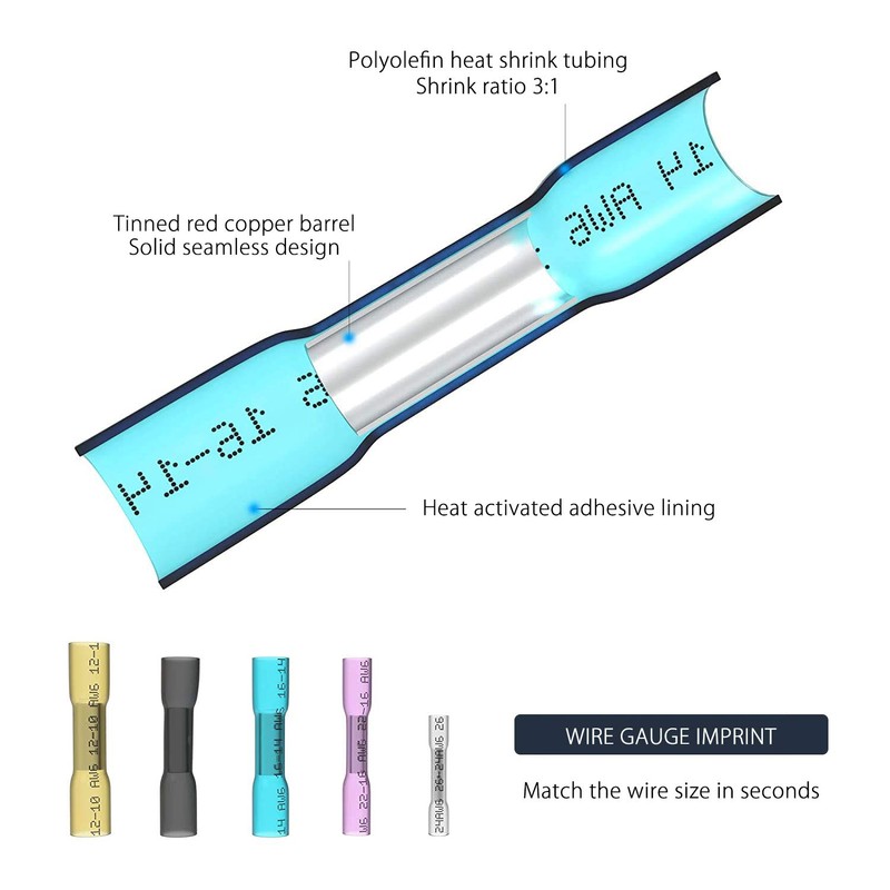 - 【MADE TO LAST】- Thanks to the thick tinned copper and seamless barrel desgin, it ensures strong and secure crimping all the time with no wire coming off issues. What's more, the polyolefin heat shrink tubing provides the high tensile strength and resistance to mechanical damage so there's no worry of rat chewing or similiar phisical damage issues. When heated with a heat gun, the adhesive melting inside create a waterproof and insulated seal, preventing electric leakage and corrosion