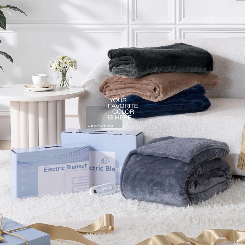 Note: It is recommended to spend 3-5 minutes carefully reading the instructions before use, which will help you use the heated blanket more effectively. (1) Warm Material: The ceamorfco heated blanket features a double-sided, smooth, skin-friendly, soft, comfortable, and warm flannel fabric. It is ideal for use in autumn and winter on sofas or beds for resting, reading, watching TV, home office work, and camping, providing you with an ultimate warm experience. (2) Multiple colors and sizes available: The ceamorfco heated blanket comes in 5 models and 4 colors. The available sizes include 50“x60”, 62“x84”, 72“x84”, 84“x90”, and 90“x100”. The light gray electric blankets, navy blue electric blankets, brown electric blankets, and dark gray electric blankets all feature a unique stitching process, ensuring each blanket is durable, shed-free, and fade-resistant. Each electric blanket combines the practicality of a regular blanket with additional warmth provided by evenly distributed heating wires inside, ensuring you stay warm all night long during cold winters and never wake up freezing in the middle of the night. Additionally, the color of the heated blanket may appear slightly different under varying light conditions and angles, offering a unique experience. (3) Warm Gift: The ceamorfco electric heated blanket makes an excellent gift for special occasions such as Christmas, birthdays, Mother's Day, Father's Day, and Thanksgiving, perfect for grandma, parents, girlfriends, daughters, friends, and elders, offering a warm and thoughtful present. (4) Features: Throw size electric blankets, twin size electric blankets, and full size electric blankets come with 1 digital remote control; queen size heated blankets and king size heated blankets come with 2 controllers that can independently control the left and right areas of the blanket. All electric blankets offer 8 adjustable temperature settings, heating up quickly within 3-5 minutes, with a temperature range of 86°F-122°F; they also feature 8 or 10-hour timer settings and automatic shut-off functionality, keeping you and your family warm during the cold winter months. (5) Usage Instructions: 1. Connect the controller to the blanket and ensure a secure connection, then plug into a power outlet; 2. Press the power button on the remote control to turn it on, and press again to turn it off; 3. Adjust the temperature using the temperature control button and set the time using the timer setting button according to your needs. (6) Safe and Reliable: The electric heating blanket has obtained dual certification from ETC and FCC, uses PTC/NTC heating wires, and features automatic overheat protection, providing you with a safer user experience. (7) Care Instructions. a. Washing instructions: Disconnect the power supply and controller before washing. Do not dry clean or use bleach; cleaning solvents may damage the insulation layer of the heating elements. b. Machine washable: Do not submerge the power cord or controller in water. Place the textile portion without the power cord into the washing machine and select a gentle or slow wash cycle for cleaning. c. Hand Washing: Hand washing the electric heated blanket is the best way to extend its lifespan. Disconnect all power cords before proceeding. Place the textile in a basin of warm water (water temperature below 100°F) and use a small amount of mild detergent or soap to clean. Soak for 5 minutes. Gently rub the textile up and down for 5 minutes; do not scrub or brush vigorously. Rinse thoroughly with cold water until all detergent residue is removed. Squeeze out excess water by hand; do not wring or use a dryer. d. Drying instructions: Do not use commercial dryers in laundry rooms—they may overheat and damage the fabric. Do not iron. Do not connect to power before it is completely dry. e. Machine drying: For drying electric heated blanket, place the product in a low-temperature dryer until completely dry. Ensure the textile has sufficient space to move freely. If the electric heated blanket shrinks after washing, gently stretch it until it returns to its original size. f. Air drying: Hang the electric heated blanket on two parallel clotheslines or drying rods, securing each end of the blanket to the clothesline or drying rod, and allow it to dry naturally. Do not use clothespins that may catch on the wires. Do not reconnect the electric blanket to the power source until it is completely dry. g. Storage: Like other bedding items, fold and store in a dry place. (8) Suitable users: This electric heat blanket is suitable for adults. Infants, disabled individuals, those insensitive to heat, and those unable to operate the controller properly should not use this electric blanket.