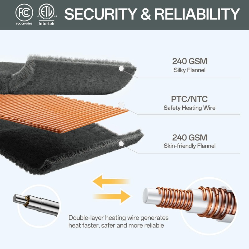 • Safe & Reliable: This full size heated blanket is certified by both ETL and FCC. It features built-in PTC/NTC dual overheat protection mechanisms, real-time temperature monitoring, and an automatic shut-off function, ensuring safe use throughout the night.