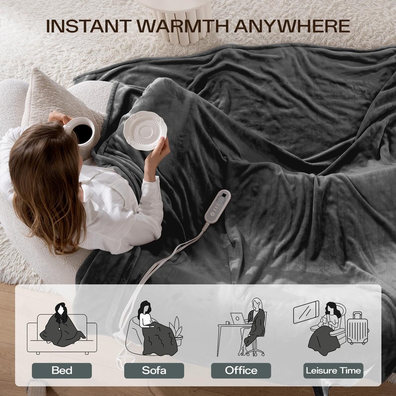 • Premium Fabric: The electric heated blanket features a double-sided 240gsm silk-smooth, skin-friendly flannel fabric, offering a soft and comfortable texture that provides warmth even when not powered. The dark gray blanket measures 72“ x 84” and is durable, shed-resistant, and colorfast, making it ideal for cold winters.