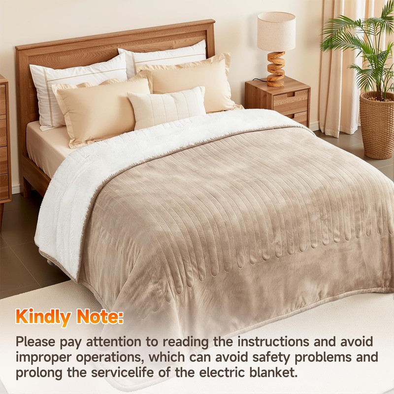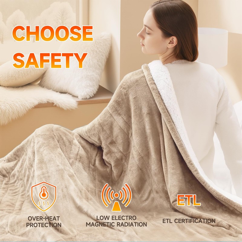 【Cozy Warmth & Customisable Comfort】 220gsm flannel + 200gsm sherpa fleece, our heated throw blanket is crafted from comfort ultra-soft premium flannel and sherpa fleece, providing a cozy and comfortable sleeping experience. Powered by advanced heating wire technology, it can precisely control the temperature to ensure safe warmth, and fast heating within 5 mins. With 10 heating levels (91.5-122°F), you have complete temperature control.
