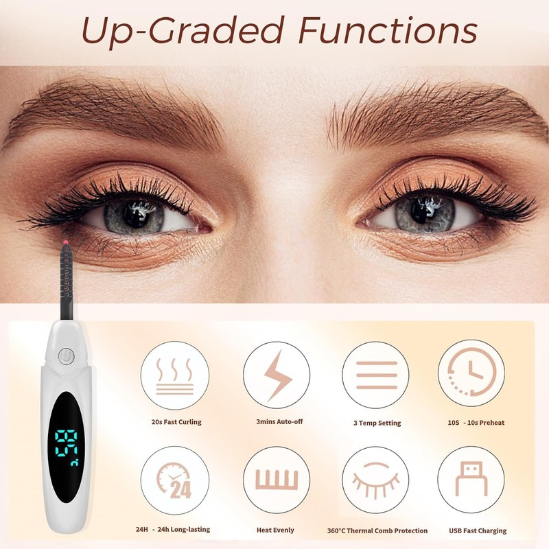 - 【3-Position Temperature Adjustment & LED Display】 The electric eyelash curler features 3 temperature settings (65℃/149℉, 85℃/185℉, 95℃/203℉) with an LED display, ensuring that you can find the perfect temperature for your needs. It's easy to use, with a simple button press to switch between settings, making it ideal for a wide range of eyelash types and makeup styles.
