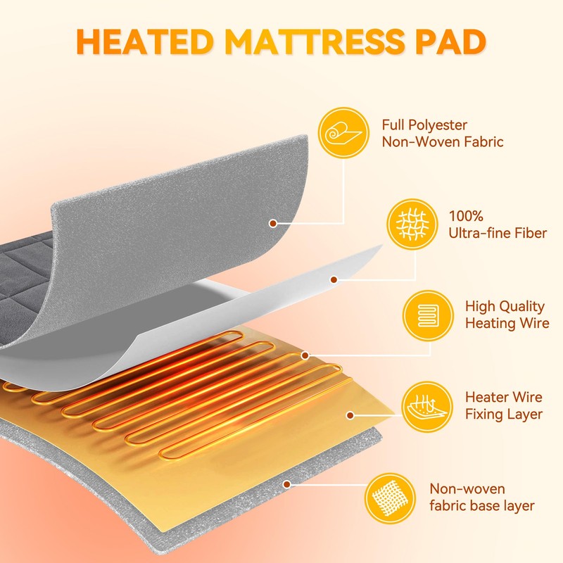 - đăVersatile Heating OptionsăOur Heated Mattress Pad features 10 adjustable heat settings, allowing you to customize your warmth for ultimate comfort. Whether you prefer a gentle warmth or a toasty embrace, there's a perfect setting for everyone. This versatility ensures that you can enjoy a cozy night's sleep no matter the season.