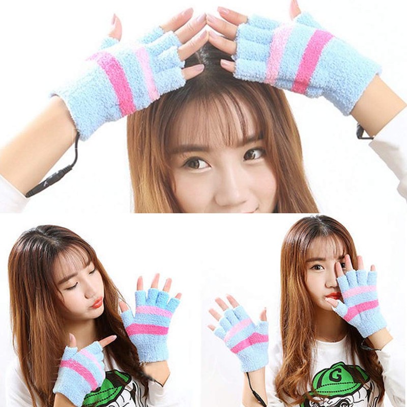 Heater Gloves -Riloer Winter USB Heated Fingerless Gloves,Thermal Hand Warmer Plush Striped Heating Half Finger Mittens