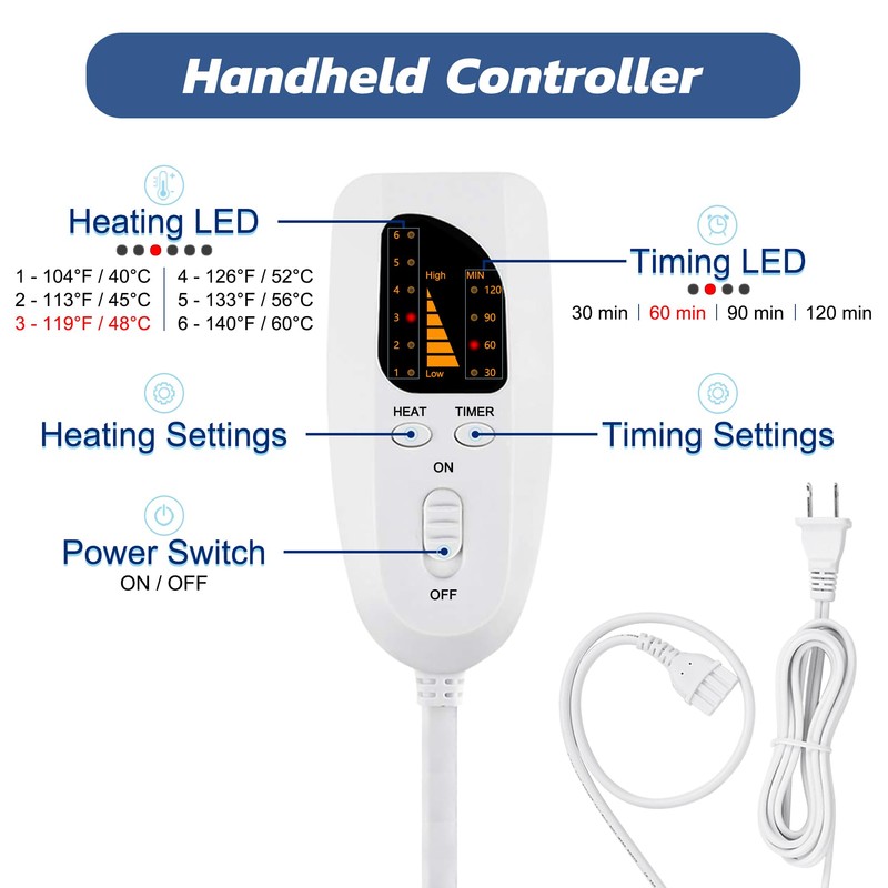 - 6 Temp Settings >> The temperature of this heating pad can be controlled by the controller, and the 6 temperature settings (40/45/48/52/56/60℃丨104℉-140℉) can easily adjust the required .