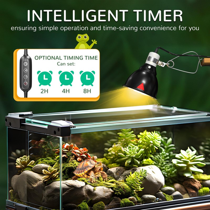 - [Dimmble Control with Timer]This reptile heat lamp comes equipped with a timer that offers 2, 4, and 8-hour options, enabling you to preset the heating duration and regulate the warmth your pet receives, even in your absence. Additionally, it features adjustable brightness levels to accommodate varying heating requirements, ensuring a cozy environment for your reptile.