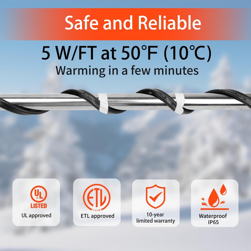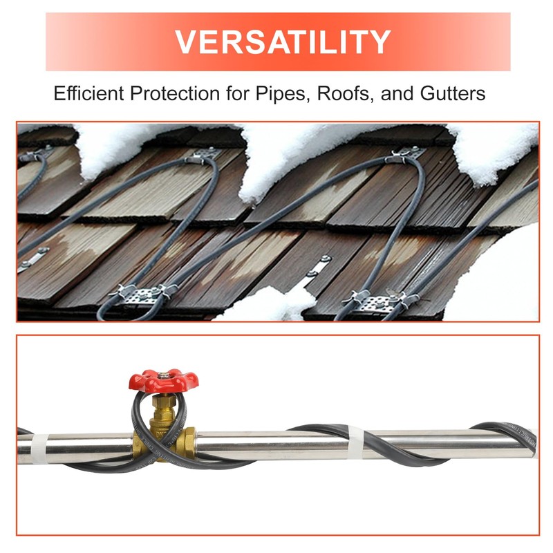 - Efficient Protection for Pipes, Roofs, and Gutters: Safeguard your plastic or metal pipes, gutters, and downspouts from freezing damage with this UL and ETL-listed heating cable.