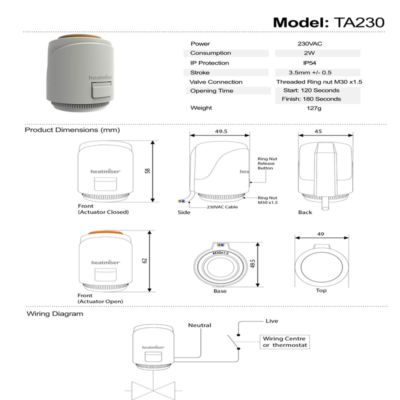 Heatmiser 230v Actuator Water Underfloor Heating M30 x 1.5 Works with The Neo...