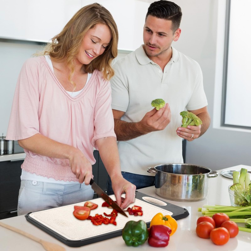 - ✅【Saving-Time Design】 Built-in juice groove and garlic grinding area of rice husk fiber cutting board,deep groove that doesn't spill liquids, can store 200ml liquid,and milling zone for garlic and ginger grinding saves time in your cooking