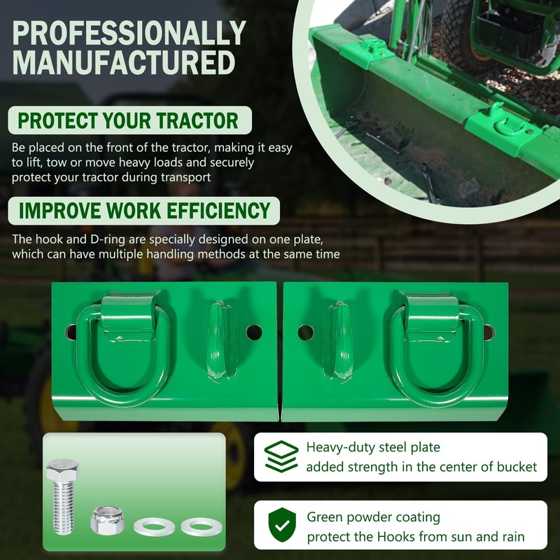 - 【Protect Tractor & Improve Work Efficiency】The Compact Tractor Grab Hooks are placed on the front of the tractor, making it easy to lift, tow or move heavy loads and securely protect your tractor during transport. The hook and D-ring are specially designed on one plate, which can have multiple handling methods at the same time, greatly improving work efficiency.