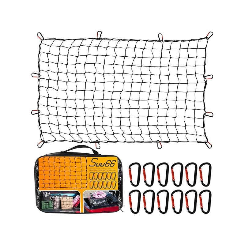 Heavy Duty Cargo Net for Pickup Truck Bed - 5' x 7' Stretches to 15' x 21' - Sturdy Latex Bungee Net Mesh - with 12 Metal Carabiners - Truck Bed Accessories for Dodge RAM, Ford, Chevy, Toyota