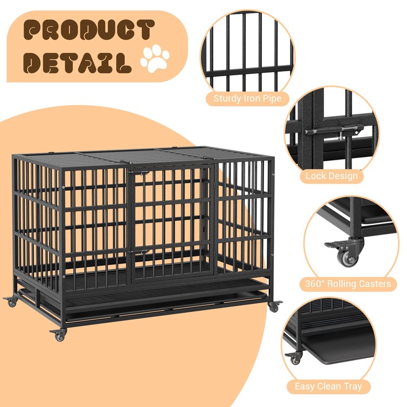 Heavy Duty Dog Crate, 48.5'' Foldable Dog Crate with Double Door, 360° Lockable Wheels and Removable Tray, Easy to Clean and Assembly, Indoor Dog Crate for Small Medium Large Dogs