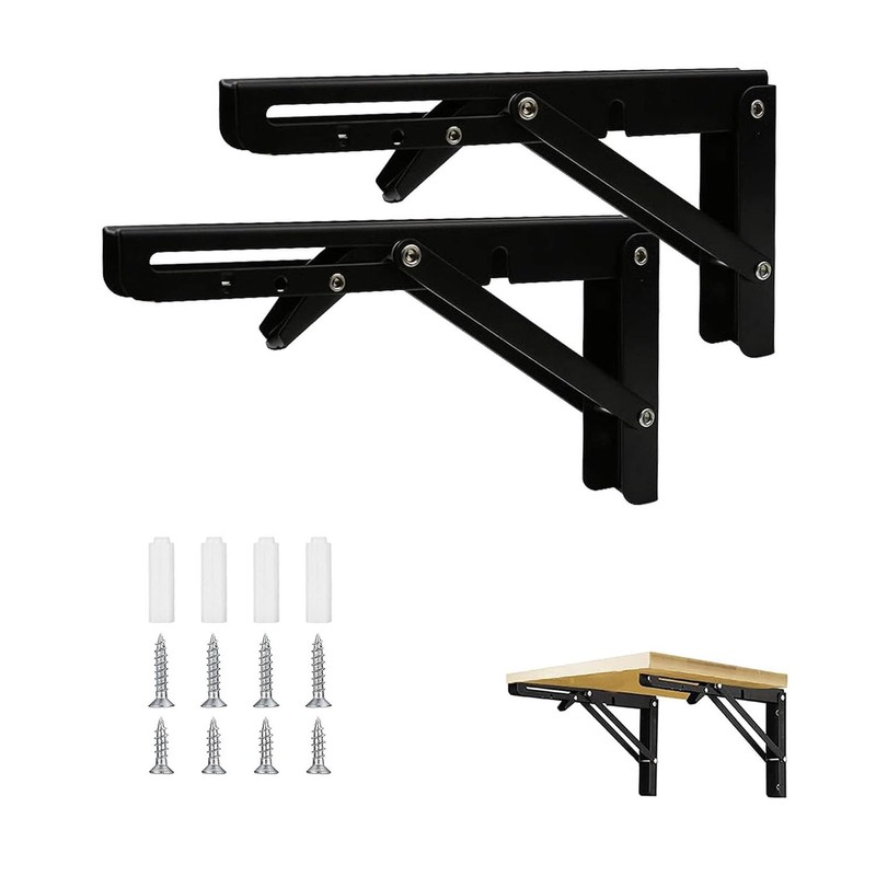 - What’s Included: Each order comes with heavy-duty folding shelf brackets + installation screws in a sleek black finish that complements most furniture styles. Dependable, functional, and built to last!