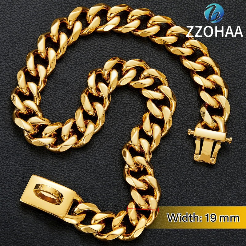 Heavy Duty Gold Dog Chain Collar,19mm Wide Solid Steel Chains Collars with Design Secure Buckle,Stronger Cuban Links Chew Proof for Dogs(14inch,Gold)