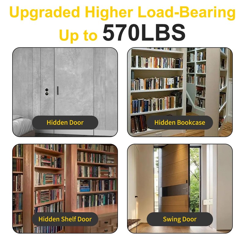 - Universal Hidden Door Solution – Works flawlessly with hidden bookshelves, Murphy beds, secret passages, cabinets, and swing doors. Includes all hardware for quick DIY installation. No specialty tools needed!