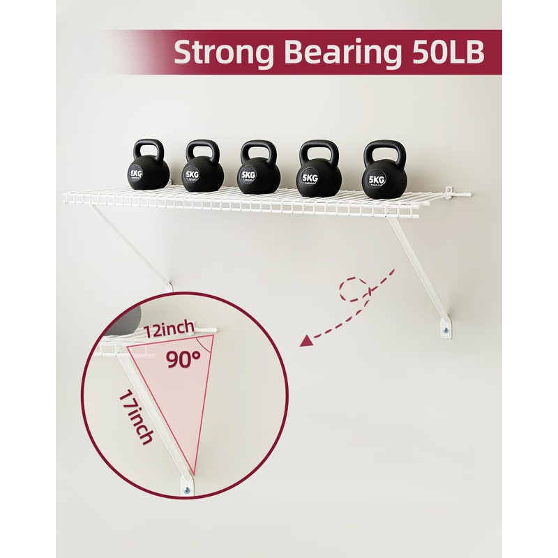 • Organize Every Corner: Multi-Room Superstar: Reinforce closet shelving, kitchen wire racks, garage storage, or laundry room shelves. Space-Saving Design: Low-profile white brackets tuck neatly under shelves – ideal for tight spaces like pantries or closets. RV/Tool Shed Ready: Lightweight yet tough enough for mobile homes and workshops.