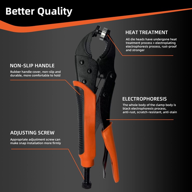 • 【More effortless】:Adjustable pliers design enables greater leverage over die-and-peg snap tools,the vice grip system allows you to get good leverage to crimp the two pieces together.