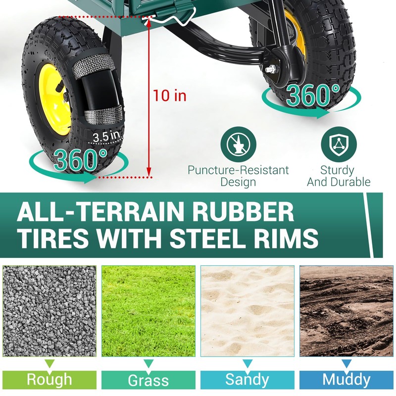 - UPGRADED TIRE TECHNOLOGY: This gardening wheelbarrow is equipped with 10-inch pneumatic rubber tires that provide excellent shock absorption and a quiet ride. These wear-resistant tires can easily cope with different surfaces, such as gravel paths or green grass, to ensure that you enjoy a hassle-free operation experience during transportation