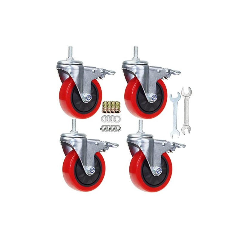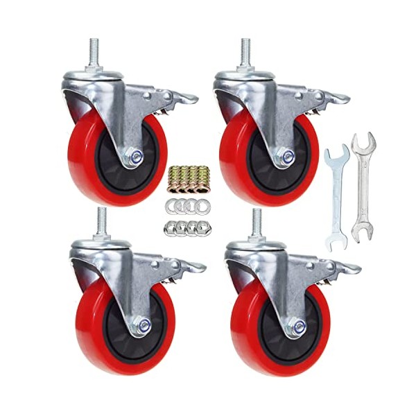 Heavy Duty Stem Caster Wheels M10-1.5X25mm Dual Locking No Noise PVC Threaded Stem Caster Wheels Pack of 4 for Workbench, Dolly, Furniture (4 Inch, Red)