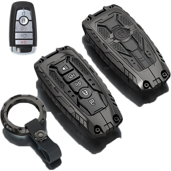 Heavy Metal Key Fob Cover for Ford, Key Fob Case Protector with Keychain Suit for Ford Explorer Fusion Escape Edge Expedition F150 F250 F350 F450 F550 Maverick Mustang 3/4/5 Buttons (A-Black)