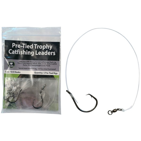 Catfish Sumo Heavyweight Circle Hooks are designed to put up to the powerful fights of trophy catfish! STOP LOSING FISH: There's a reason you're missing so many fish--and it's your hooks. Catfish Sumo hooks are made from forged steel, offset with a razor sharp tip to ensure the best hook set, and keep your lunkers on! PRE-TIED RIGS: 5 pre-tied rigs, packed in individual bags so they're easy to whip out and tie on. 12" LEADERS: the right length for drifting, bank fishing, and anchoring. OPTIMIZED KNOTS: We optimized the best knots for each end of this leader. No need to watch countless youtube knot videos, and still end up wondering if you picked the right knot. SPORTSMAN'S DREAM: Hook sets in a fish's mouth or lip and helps prevent gut-hooking fish. This means you'll be able to Catch, Photo, Release fish quickly and safely. BEARING SWIVELS: Cheap ball swivels simply won't do when it comes to trophy catfish. These bearing swivels will last through the toughest catfish rolls. WARNING: Sharp hooks. Why Bearing Swivels? Cheap bearing swivels are fine to start with, but they simply won't do when it comes to trophy catfish. First, they don't spin when under pressure, which is exactly what big catfish do. Second, the rings aren't solid loops, so they can deteriorate and pop apart after use. Catfish Sumo Pre-Tied Leaders use high quality bearing swivels that can easily handle any state record. Packed Flat to Save Space Bulky boxes, ziplock bags stuffed with leaders, and loose tackle add to the frustration of having to tie on a new rig. These rigs are individually packed in flat clear bags to make them as easy as possible to store, and use. Breaking off a rig is frustrating. It's much easier to get over when you have Catfish Sumo Pre-Tied rigs ready to go instantly whenever you need them! Besides, even tying your rigs while watching TV is still a pain. Save time and frustration with Catfish Sumo Pre-Tied Trophy Catfish Rigs.