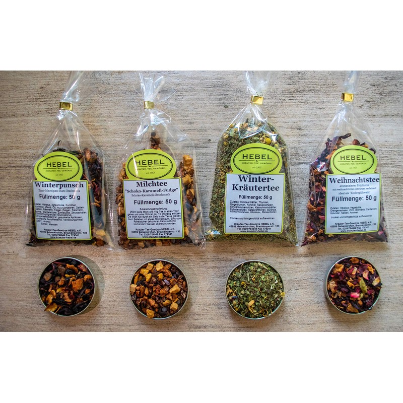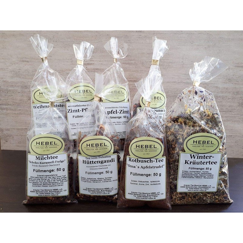 - Fruit tea Christmas tea 50 g, fruit tea winter punch 50 g, fruit tea apple cinnamon 50 g, fruit tea cinnamon plum 50 g, fruit tea Hüttengaudi 50 g