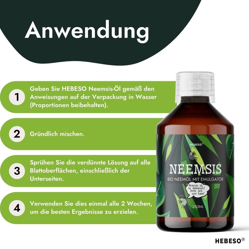 - HEBESO NEEMSIS is the highest quality organic neem oil mixed with a natural emulsifier. The emulsifier is necessary for the neem oil to mix evenly with the water. All you need to do is mix our neem oil with water and start spraying.
