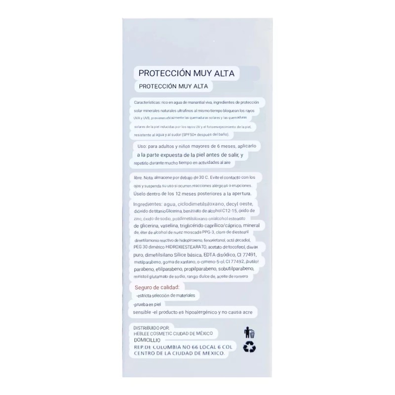 Rico en agua viva de manantial, ingredientes de protección solar minerales naturales ultra finos que bloquean al mismo tiempo los rayos UVA y UVB, previenen eficazmente las quemaduras solares y las quemaduras solares y el foto envejecimiento de la piel inducidos por rayos UV, impermeable y resistente al sudor.
