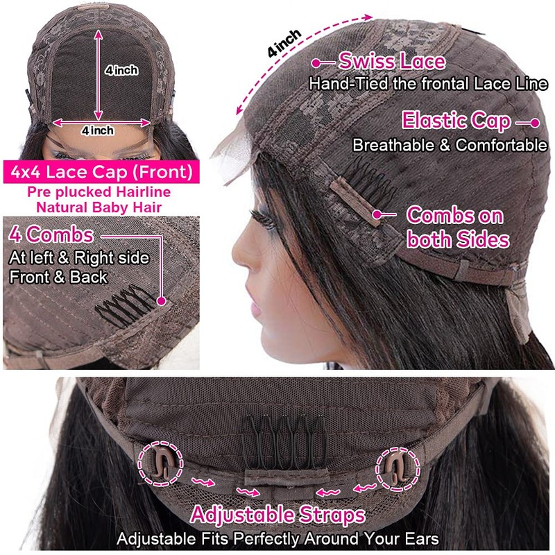 - Human Hair Wigs Details:180% Density,Full And Thick.4x4 Lace Closure Wigs Human Hair,Breathable & Durable Swiss Lace.Free Part,Can Make Middle Part or Side Part,Suitable for Most Skins