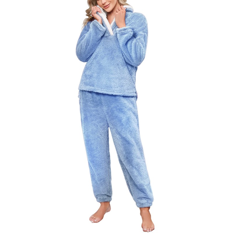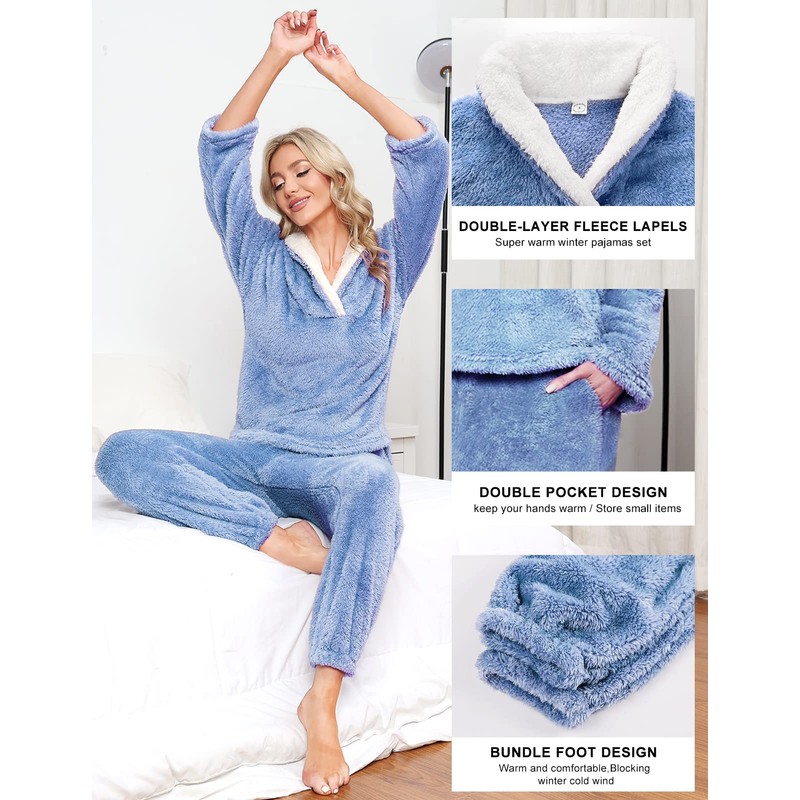 - 【Unique Cozy Pjs】Women's long-sleeved pajamas are designed with a lapel, Turned out white collar and V-neckline to this womens fleece pajamas set brings a rather novel accent. Fuzzy pajama pants the double pockets at the waist will keep your hands warm and can also be used to keep your phone and some small items.