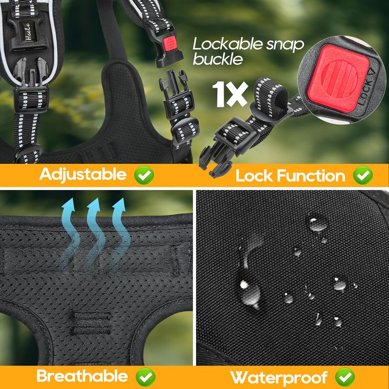 • Easy to put on and take off: The dog harness without pull has two simple buckles on the waist straps and a lockable quick snap buckle on the neckline. This makes it easy to put on and take off without having to slip over the dog's head and adjusting the straps every time.