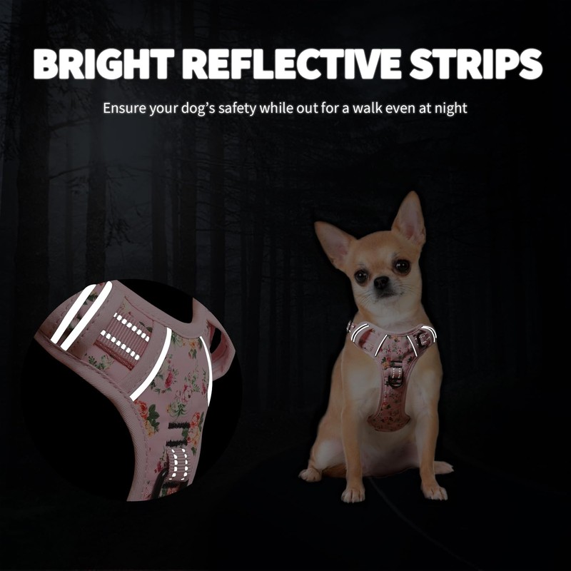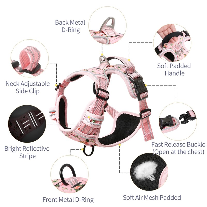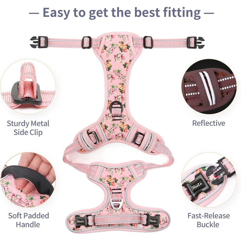 HEELE Dog Harness, No Pull Adjustable Padded Reflective Harness for Small Medium Large Dogs with Handle for Walking Training, Flower-Pink, M