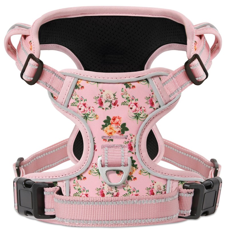 HEELE Dog Harness, No Pull Adjustable Padded Reflective Harness for Small Medium Large Dogs with Handle for Walking Training, Flower-Pink, M