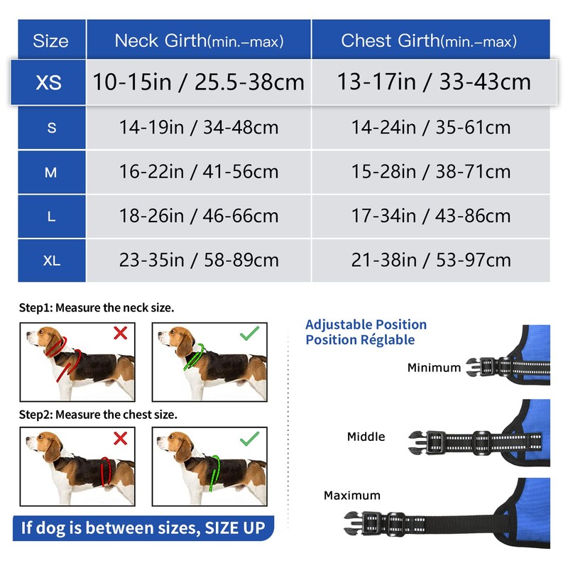 - Easy to put on and take off - HEELE dog harness with adjustable chest strap and 2 quick releases to ensure the safety of your dog and create a custom fit for your dog. Size XS: neck 25.5-38cm, chest 33-43cm. S: neck 34-48cm, chest 35-61cm. Size M: neck 41-56cm, chest 38-71cm. Size L: neck 46-66cm, chest 43-86cm. Size XL: neck 58-89cm, chest 53-97cm.