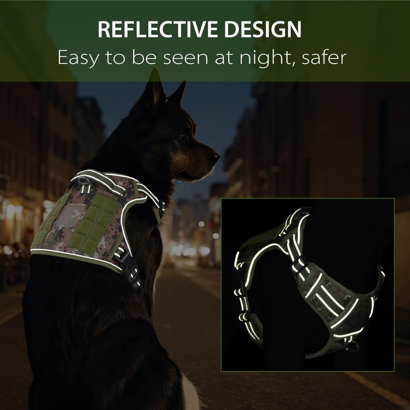 HEELE Dog Harness, Tactical Dog Harness with Molle Panel, Harness for Small Medium Large Dogs No Pull Adjustable Padded Reflective Harness with Handle for Walking Training, Camo Green, M