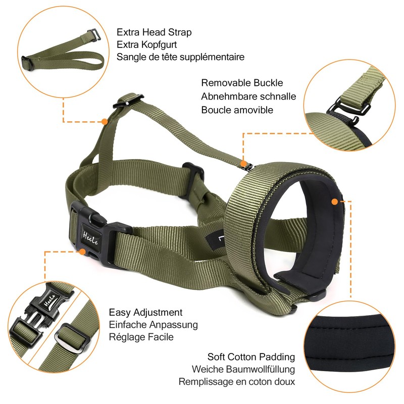 HEELE Dog Muzzle with Head Strap and Adjustable Loop and Soft Neoprene Padding, No More Chafing, Muzzle for Medium Dogs to Prevent Barking Biting and Chewing, Gentle Dog Muzzles, Army Green, M