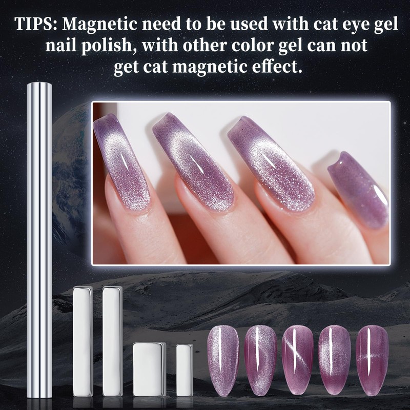 - 【Easy To Use】First, apply CAT EYE GEL POLISH; Second, place the magnet on your nails for 10-15 seconds to get a cat eye effect (please keep the magnet side facing your nails, the closer you can, but do not touch the nail surface); Third, immediately with UV light for 120 Seconds or LED light for 60 seconds; Finally, apply a layer of top coat.(IF THE MAGNET ISN'T WORKING, TRY A DIFFERENT CAT EYE GEL NAIL POLISH)