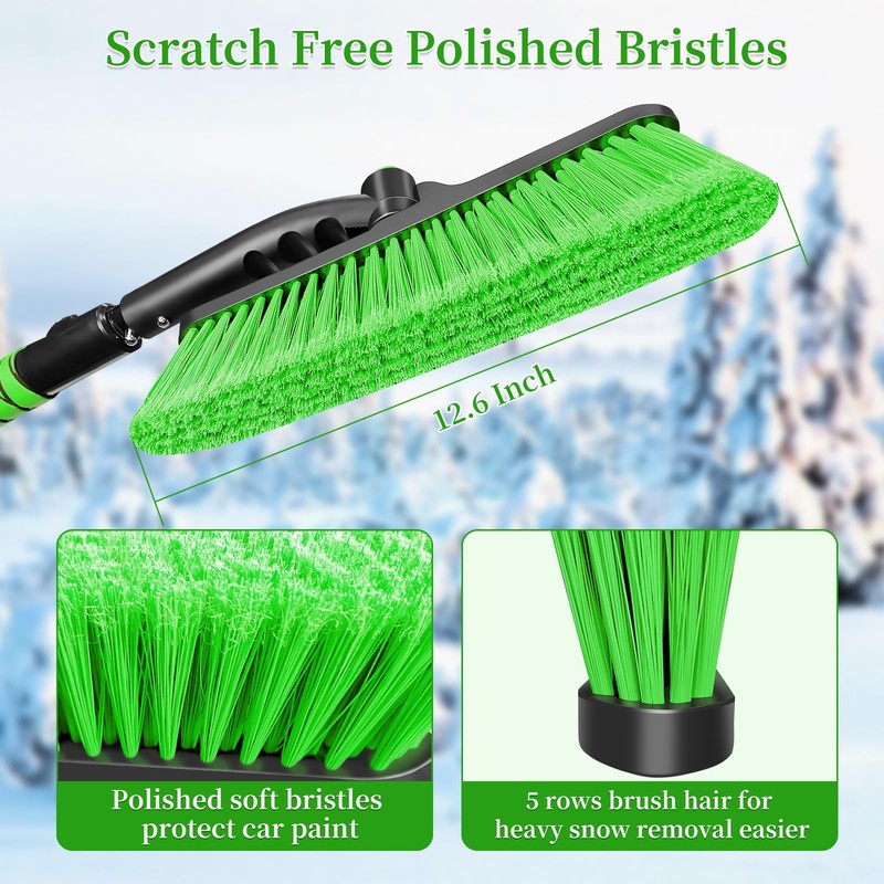 - 12.6 Inch Large Snow Brush -- Effortlessly clears heavy snow with its industrial-strength bristles. The 270° swivel mechanism adapts to clean various positions.