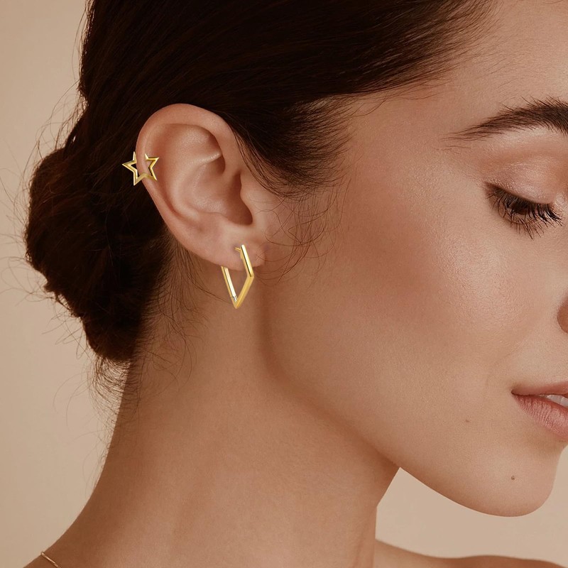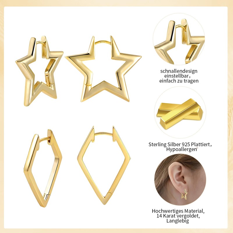 - Hoop earrings gold set: you will receive 1 pair of star hoop earrings and 1 pair of diamond earrings, total 2 pairs. There are 2 different styles to choose from. Hypoallergenic hoop earrings are simple and chic. They are essential accessory for everyday wear, any face shape, any occasion and any outfit style.