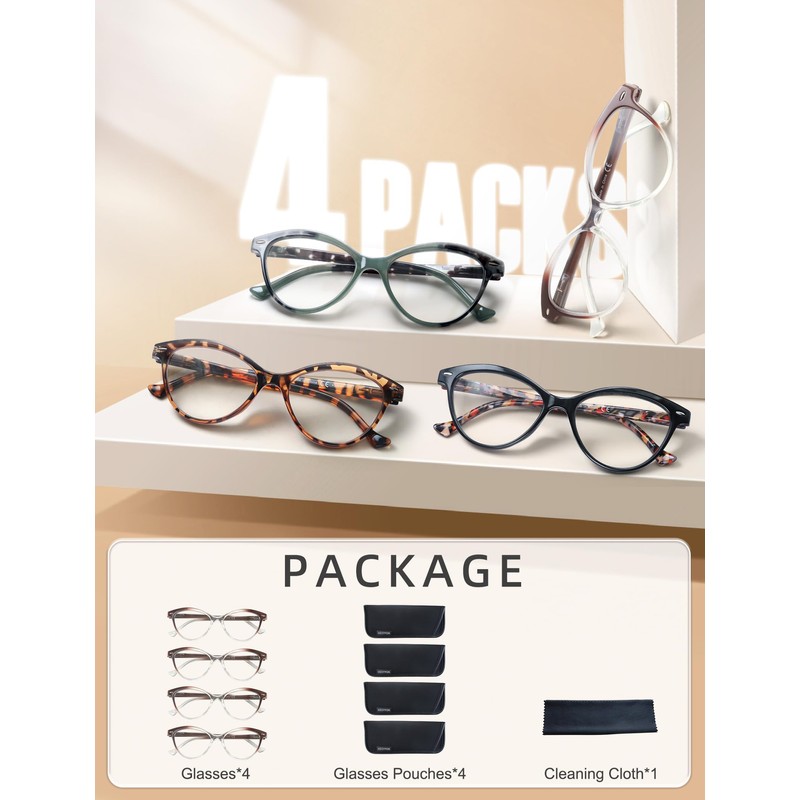 - 【4 Pack Women Reading Glasses】:4 Pack Cateye reading glasses women readers,Including 4 pouch and 1 cloth,gives you great value for a high quality product.